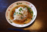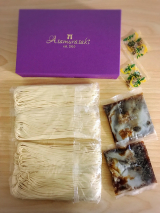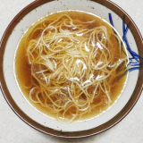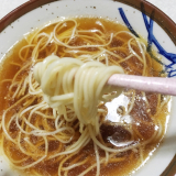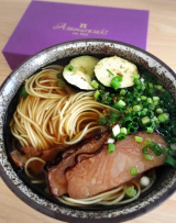 麺はじっくりと水分を飛ばすことにより、限りなく生麺に近い食感をもった半生麺を使用。のど越しの良い、もちもちとした食感が特長のストレートの中細麺です。スープはかき醤油と淡口醤油、丸鶏の鶏ガラをベースとしたしょうゆ味です。さばだし・煮干の魚介のうま味も加え、すっきりとしたスープに仕上げています。やくみにゆず皮を別添しておりますので、お好みでかけてお召し上がりください。