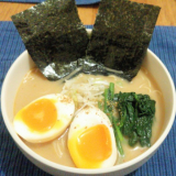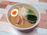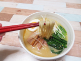 麺はじっくりと水分を飛ばすことにより、限りなく生麺に近い食感をもった半生麺を使用。のど越しの良い、もちもちとした食感が特長のストレートの中細麺です。スープはかき醤油と淡口醤油、濃厚な豚骨白湯をベースとしたとんこつしょうゆ味です。かき醤油のうま味と豚骨のコクが特長のまろやかでキレのあるスープに仕上げています。やくみにゆず皮を別添しておりますので、お好みでかけてお召し上がりください。