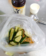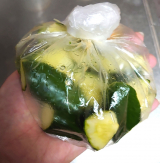 お好みの野菜を切って、ジップロックなどに浅漬けの素と一緒に入れます。少し揉んで40分待つだけで美味しい浅漬けが出来上がります。