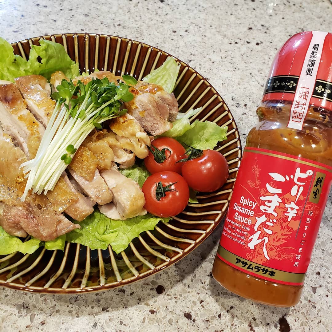【ピリ辛ごまだれ】 . おいしいピリ辛タレを見つけました😋 ごまだれは好きだけど~食べてるうちにくどくなる だから、途中で一味をかけちゃってたのですが これなら✨最後までおいしく食べられます。 鶏もも肉を塩コショウしてオーブンレンジで焼いただけ +ピリ辛ごまだれを付けて食べました🍴 豚しゃぶはもちろん、サラダのドレッシングやミルフィーユ鍋など ポン酢代わりとしても使えそうです! 激辛ではないので、うちは家族みんなで使えました👍 . . . #PR #アサムラサキ #モニプラ #モニプラファンブログ #ごまだれ #ピリ辛ごまだれ #ピリ辛 #辛い #辛い物好き #鍋 #ごまだれ派 #monipla #asamurasaki_fan #ソース #ピリ辛タレ #鶏もも肉 #おうちごはん #ステイホーム