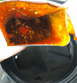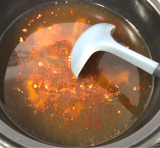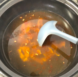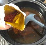 【1】鍋にもつ鍋スープと唐辛子を入れ、沸騰させます。(付属の唐辛子で辛さの調整をしてください。)