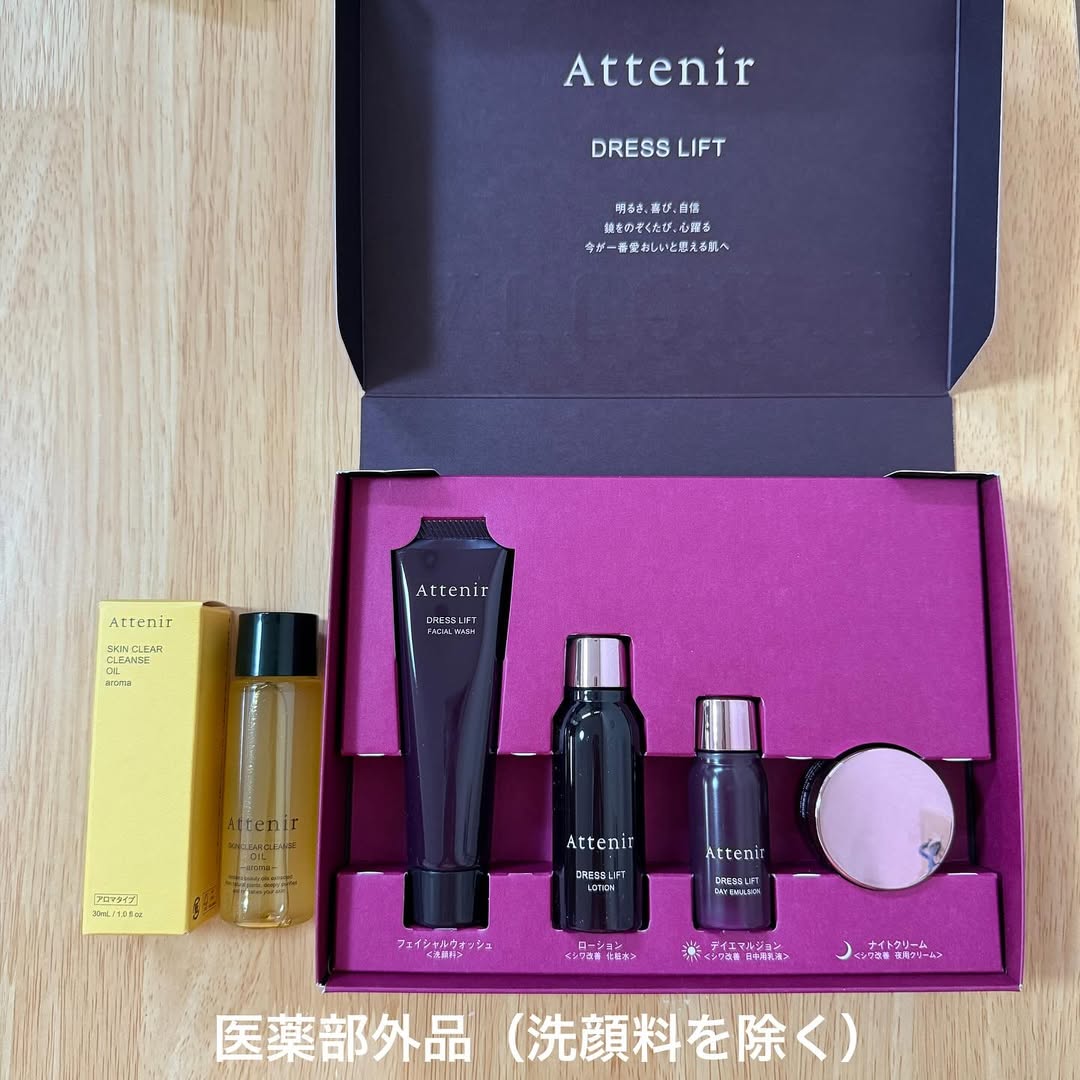 肌のハリ不足と乾燥小じわが気になるので、今までのスキンケアを見直そうと思い、ドレスリフト14日間セット+スキンクリア クレンズ オイル 10日分を使ってみました。 洗顔料、化粧水、乳液、クリームのセットとクレンジングオイルになります。 クレンジングオイルはさらりとしたオイルで摩擦レスでメイクとなじみます。 ベタベタせずしっとりとした洗い上がり。 洗顔料は泡立ちはとても良く、キメ細かい泡で心地よく洗えます。 洗っている途中で泡がへたったり消えることもないので、快適に使用できます。 化粧水はとろみがありますがべたつかない軽いつけ心地。 のびはとても良く、肌にスーッとなじみます。 日中用乳液はやわらかいミルク状で肌なじみがとても良いです。 しっとりとするようななめらかなつけ心地。 夜用クリームはコクっとした濃厚な質感ですが、のびは良いです。 べたつくこともないので快適に使えます。 乾燥小じわが気になる目もと、口もとには重ねづけをしています。 ローズの上品な香りに包まれながらスキンケアできるところも気に入っています。 シワ改善に効果が期待あるそうです、スキンケアの時間が楽しみになりそうです。 #PR #アテニア #ドレスリフト #薬用エイジングケア ※ #monipla #attenir_fan ※年齢に応じたお手入れのこと。