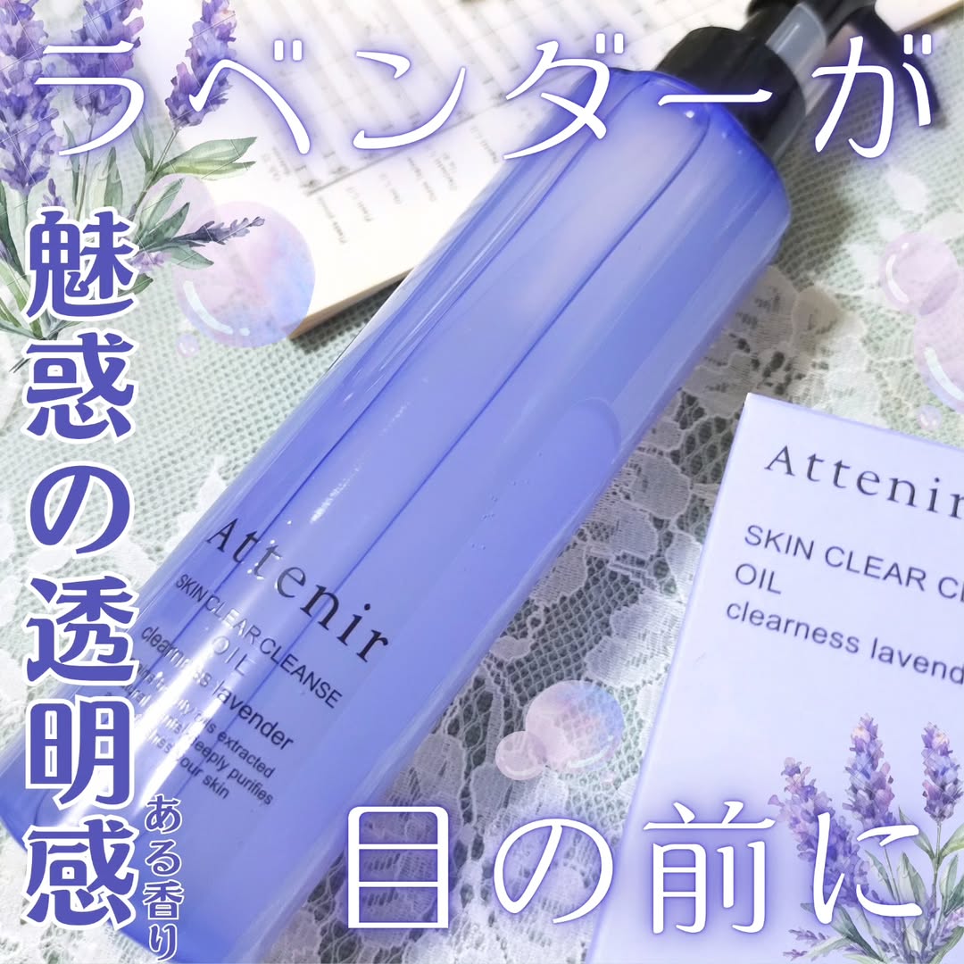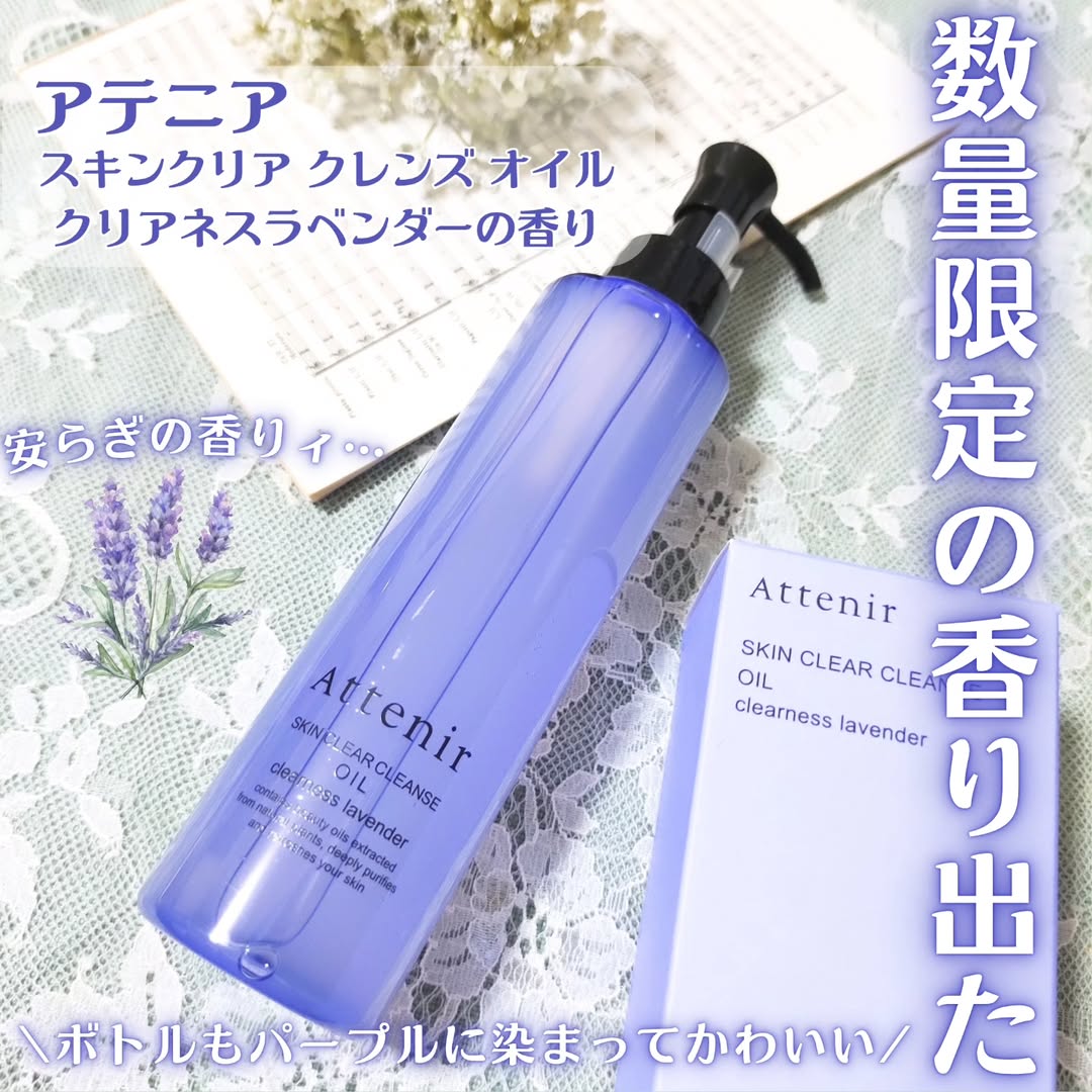 -`📢⋆ 深呼吸必至の透明感漂うラベンダーの香り🥹🥹 ┈┈┈┈┈┈┈┈┈┈ ▶アテニア スキンクリア クレンズ オイル クリアネスラベンダーの香り ┈┈┈┈┈┈┈┈┈┈ 数量限定発売の新しい香り💜 まさかのラベンダーが登場っ!!💞🪻 ボトルもパープルに染まってかわいい! ノーマルタイプを使ったことあるけど そっちは柑橘系でリフレッシュする感じで、 クリアネスラベンダーは安らぎ感半端ない😌🤍 メイク落ちもさすがのひとことで、 乳化させて洗い流すときちんとオフ◎ 肌もしっとり洗い上がって、 つっぱりがなく乾燥も気にならない🙆♀️ クッション性ある肉厚なテクスチャーだから アイメイクなどお肌が敏感な箇所も 落としやすいなぁと思います! アテニアさんは香りも楽しめる、 スキンケアがあって良いですね〜!🥹✨🩷 ┈┈┈┈┈┈┈┈┈┈ @attenir_official #PR #アテニア #スキンクリアクレンズオイル #クレンジング #クリアネスラベンダー #monipla #attenir_fan #クレンジングオイル #スキンケア