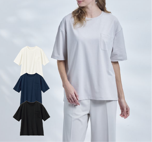 体のラインを拾いにくい、透けにくく適度に厚みのある生地を厳選。二の腕や肩まわりが気になる方ののために半袖・フレンチ袖のどちらも袖丈長め設定で、腕の付け根をカバーします。