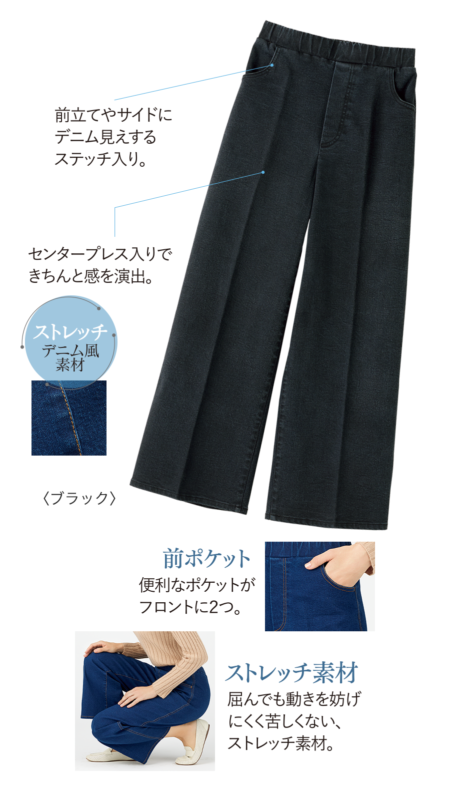 大人女性のための綺麗めデニム 「ミラクルワイドデニム」 前立てやサイドにデニム見えするステッチ入り。 センタープレス入りできちんと感を演出。 ウエストゴムと前ポケット2つ。屈んでも動きを妨げにくく苦しくないストレッチ素材 ウエストゴムなので楽ちん! 全体がストレッチ素材なのでしゃがんでラク!! #PR #株式会社アテニア #アテニアコレクション #ミラクルワイドデニム #monipla 2026/03/10