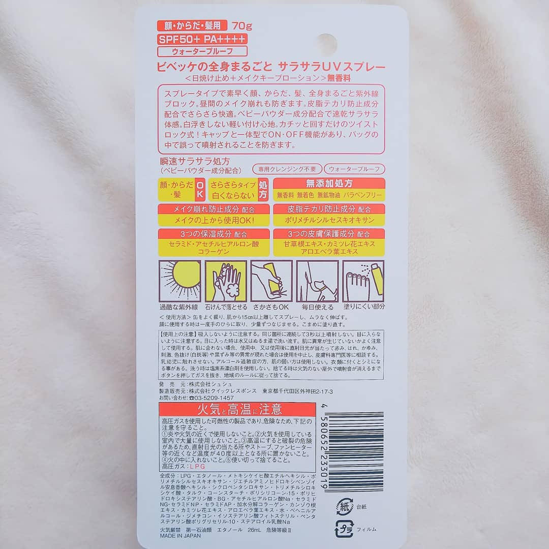 . ビベッケの全身まるごと サラサラUVスプレー70g🌞*° こちらは持ち運び便利なミニサイズ! SPF50+・PA++++で素早く、顔、体、髪、全身まるごと紫外線をブロックしてくれます🚫 ベビーパウダー成分を配合していて瞬速サラサラ処方。 日中のメイク崩れも防いでくれるメイクキープ機能も! 白くならない透明・速乾・無添加処方です🙆🏻♀️ 保湿成分 ヒアルロン酸・セラミド・コラーゲン、肌保護成分 甘草根エキス・カミツレ花エキス・アロエベラ葉エキスを配合。 ツイストロック式を採用しているのでキャップいらずで便利です。 逆さでの使用もOK👌 専用クレンジングは不要です! スプレータイプは時間がない時も全身をささっと紫外線対策が出来てとても便利。 キャップの取り外しがなく、クルッと回せばいいだけなのでとても使いやすいです! スプレーした後はさらさらでスベスベの触り心地🤍 つけ心地は重たさやベタつきがなく、とっても軽いつけ心地。 マスクをしていてもあまりベタついてこないです☺️ メイクによく馴染み、ミストがきめ細かいのでスプレーした跡もありません。 スプレーするとよくポツポツと跡が出来ますが、これは全くありませんでした! お休みの日はスキンケア後にすぐスプレーしていますが、肌荒れを起こしたりしないので安心して使用しています❣️ マスクかぶれにもならなかったです😊👌 日焼け止めはクレンジングで落とさなきゃいけないので、日焼け止めだけの日は肌負担がありましたがこちらのUVスプレーは石鹸で落とせるのでとっても助かりました!!! 1年中日焼け止めを使用していますが、スプレータイプはこまめに紫外線対策が出来るので重宝しています✨ #vibeke#ビベッケの全身まるごとサラサラuvスプレー70g#ビベッケ#UVケア#スキンケア#日焼け止め#紫外線対策#日焼け止めスプレー#uvスプレー#メイクキープ #sunscreen#sunscreenspray#skincare#makeupkeep#monipla#awaoffton_fan#🌞🚫🤍