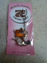 本革レザー素材でできた犬のミニチュア付き携帯ストラップです。