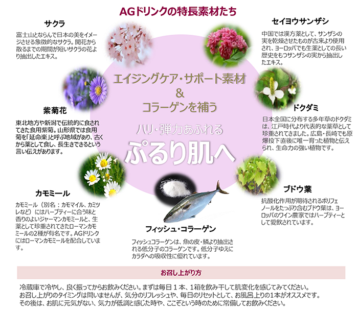 インナービューティーに着目したエイジングケアサポート素材として6種のハーブ(桜の花、紫菊花、ドクダミ、セイヨウサンザシ、カモミール、ブドウ葉)を厳選※1配合。とりわけ、富士山とならび日本の美をイメージさせる象徴的なサクラは、開花から散るまでの期間が短く、サクラの花よりの抽出エキスは注目成分です。