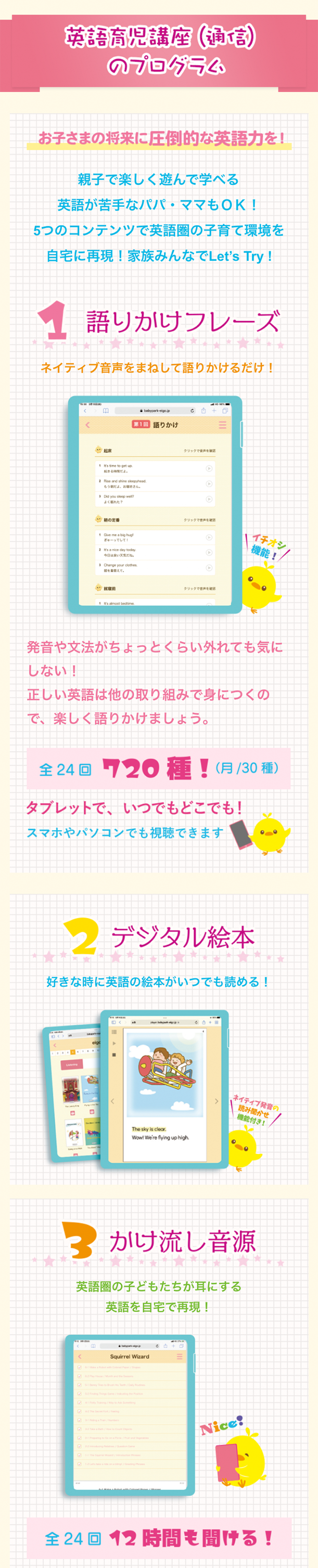 ベビーパークの英語育児講座(通信)は、英語を勉強して習得するのではなく、日本語と同じように、1つの言語として、英語を生活の中に取り入れて身に付けるプログラムです。