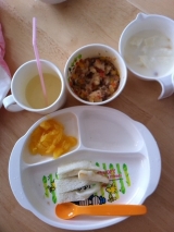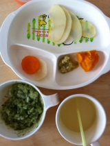 朝ごはんワカメ粥(4分粥80g、ワカメ2切、ほうれん草粉末)スティック大根、にんじんかぼちゃ白菜ベビーダノンりんごとにんじんスティックりんご野菜スープスティックりんごは手づかみ食べしましたりんご以外は完食です昼ごはんスティック食パン野菜のトマト煮込み(牛肉、トマト、パプリカ、玉… 2013/05/05