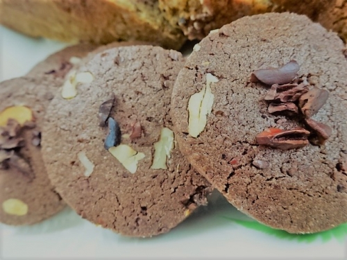 <バナナパウンドケーキ材料> カカオニブ40g バター80g 強力粉180g ベーキングパウダー小さじ2 てんさい糖150g よく熟したバナナ2本 卵大2個 酢大さじ1 <MIXナッツチョコクッキー材料> カカオニブ40g バター120g 小麦粉 170g ココア50g てんさい糖7… 2017/05/30
