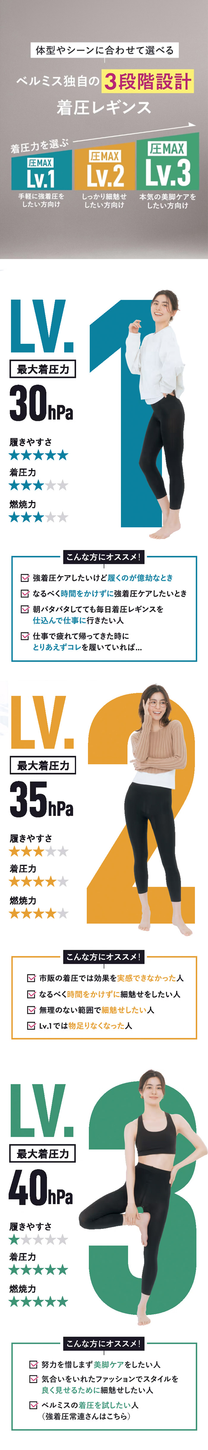 体型やシーンに合わせて選べるベルミス独自の3段階設計着圧レギンス