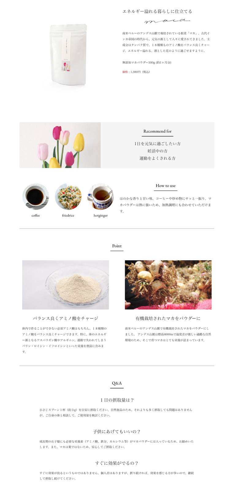 南米ペルーのアンデス山脈で栽培されている根菜「マカ」。古代インカ帝国の時代から、元気の源として人々に愛されてきました。主成分はタンパク質で、18種類ものアミノ酸をバランス良くチャージ。エネルギー溢れる、凛とした花のように過ごせますように。