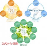 水、BG、ヤシ油脂肪酸PEG-7グリセリル、ポリソルベート60、加水分解コラーゲン、ヒアルロン酸Na、セラミド1、セラミド3、セラミド6Ⅱ、ユキノシタエキス、ソメイヨシノ葉エキス、ワイルドタイムエキス、オタネニンジン根エキス、マヨラナ葉エキス、オウゴン根エキス、カンゾウ根エキス、ナツメ果実エキス、セイヨウシロヤナギ樹皮エキス、オレンジ油、グレープフルーツ果皮油、ラベンダー油、ココイルグルタミン酸TEA、(アクリレーツ/アクリル酸アルキル(C10-30))クロスポリマー、水酸化Na、フィトスフィンゴシン、コレステロール、ラウロイルラクチレートNa、カルボマー、キサンタンガム、EDTA-2Na、フェノキシエタノール