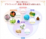 BG、グリセリン、α-アルブチンサン、サクシニルアテロコラーゲン、ヒアルロン酸Na、トレハロース、ザクロ花エキス、ネルゲニアリゲラタ根エキス、エンドウエキス、加水分解酵母、アラントイン、グリチルリチン酸2K、アルギン酸Na、パンテノール、マルトデキストリン、ジラウリン酸スクロース、ココイルグルタミン酸Na、ホホバワックスPEG-120、PEG-6、PEG-32、PEG-60、水添ヒマシ油、カルボマー水酸化K、カルミン、レモン果皮油、グレープフルーツ果皮油、ローズマリー油、マヨラナ葉油、ローマカミツレ花油、フェノキエタノール、ミチルオアラベン、リン酸2Na、リン酸K