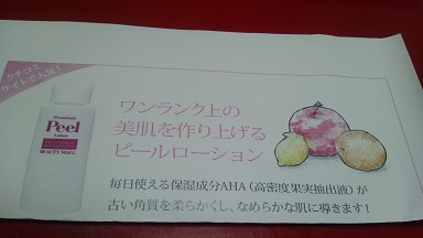 プレミアムピールローションは 毎日使える保湿成分AHA(高密度果実抽出液)が、古い角質を柔らかくし、なめらかな肌に導きます まずは、洗顔後に普通の化粧水のように使いました しっとりして、いい感じです(^^) お薦めの「拭き取り」は、コットンに取って気になる部分を軽く拭き取る … 2014/09/28