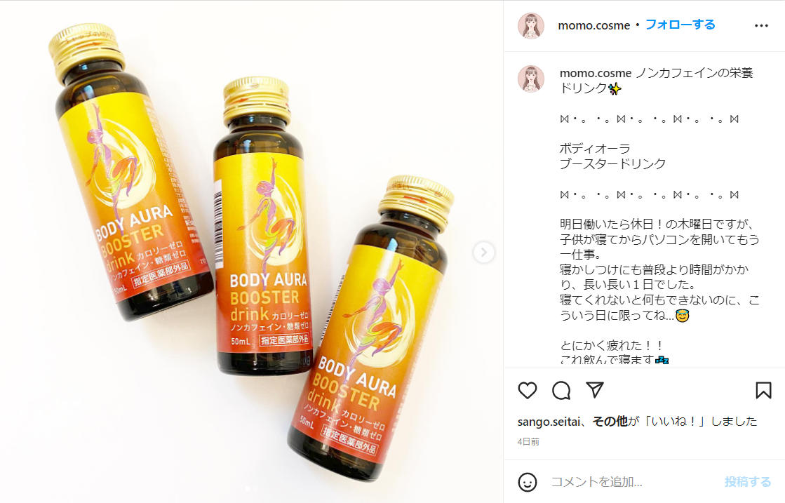 \オーラ、切れてない?/ ❤️BODY AURA BOOSTER drink❤️ をお試しさせていただきました🥰 働く女性&ママにぴったり🤱💓 ノンカフェイン、カロリーゼロ、糖質ゼロ0️⃣✨ 身体抵抗力の維持・改善や疲労回復・予防に✨ 消化管へ吸収されやすく、ビタミンB1を多く 生産するフルスルチアミン(ビタミンB1誘導体) 配合で効率よくサポート🥰⭐️⭐️ ドリンクタイプなので成分を素早く吸収🥤 ミックスフルーツ風味で飲みやすいドリンクです🍎 ダイエット中や寝る前も飲めるのが嬉しいです😆 私は娘が寝た後遅い時間にPCで作業をすることが 多いので、夜娘が寝たあとに飲みました💓 いつもよりスッキリして作業効率上がったかも😊 免疫機能の維持機能があるので、夜飲むと 朝はいつもよりスッキリ起きられたし 次の日も元気に動ける感じがしました😳✨ なにより飲むだけで手軽なのがいいですね💓 冷やして飲むと美味しかったです🧊 冷蔵庫に常備しておきたいな🥰 #ボディオーラ #ブースタードリンク #サプリ #monipla #bodyaura_fan 2022/09/16