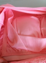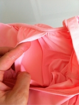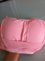 立体裁断のブラ部分、カップ両サイドのプッシュアップパネル、引き上げサイドプッシュパネルと引き上げサイドプッシュテープでバストを引き上げ、カップ下の盛り上げパワーネットとアンダーのバストアップテープでバストを持ち上げます。