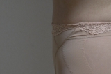 パワーのあるストレッチ素材をヒップの下にベルト状にほどこし、太ももに流れがちなお尻のお肉をグッと押しあげてヒップラインを美しく整えます。ウエスト部分は身生地を二重使いにし、その上にバラ柄のストレッチレースをあしらいおしゃれに仕上げました。穿き丈を少し高めのウエストあたりで設計していますのでずれ下がりにくく、腰のお肉のはみ出しをサポートしてすっきりとしたウエストラインをつくります。