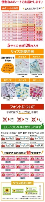 名前が消えない!貼るだけラクチン♪お子様のお名前付けに大活躍♪たっぷり使える129枚セット&5サイズ!可愛いキャラクターデザイン!入園入学のお名前つけに便利なお名前シール(透明タイプ)です。シールは洗濯してもOKで耐久性に優れています。色は透明だから、いろんなところに圧着できます!親しみやすい絵柄+お名前で文字の読めないお子様も自分の目印を覚えられます♪忙しいママを応援します♪