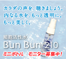 BunBun210は、これまでにない独自の技術で、水の分子レベルまでの構造に着目し、水に活力を与えました。また、非常に効果で希少価値の海洋ミネラルの力で細胞を活性化する力をプラス。水のクラスターがとても小さく、活性水素水を豊富に含んでいる元気なお水です。体の中の水をきれいにして、体もイキイキとしてきます。天然成分だけでできた活力のあるお水なので安心してどこにでもお使いいただけます。