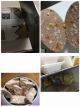 チキン(生)80%、野菜類(ニンジン・コーン・エンドウ豆)、大豆、穀類(トウモロコシ種皮/グルテン除去・繊維源)、玄米(破砕・ゆで)、魚油(オメガ3脂肪酸)、カラギーナン、ローカストビーンガム、カシアガム、グアーガム、ビタミン・ミネラル類(ビタミンA、ビタミンB1[チアミン]、ビタミンB2、ビタミンB3[ナイアシン]、ビタミンB6、ビタミンB12、ビタミンD、ビタミンE、ビタミンK、葉酸、パントテン酸カルシウム、カルシウム、リン、ナトリウム、マグネシウム、塩化コリン、鉄、亜鉛、銅、マンガン、ヨウ素、セレン)、ケルプ(海藻)