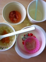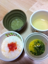 今朝は早い時間に食べさせてみましたそろそろ手づかみ食べする頃だと保険師さんに聞いて手づかみしてもよいように、レジャーシートを敷いて汚れてもいい準備♪ひじきとほうれん草粥(五分粥60g、ほうれん草10g、みじん切りひじき少々)豆腐のパプリカとリンゴソース野菜スープお腹がすいてなかったのか、あまり食べ… 2013/03/29