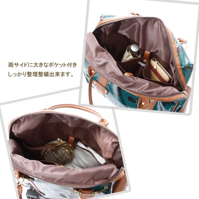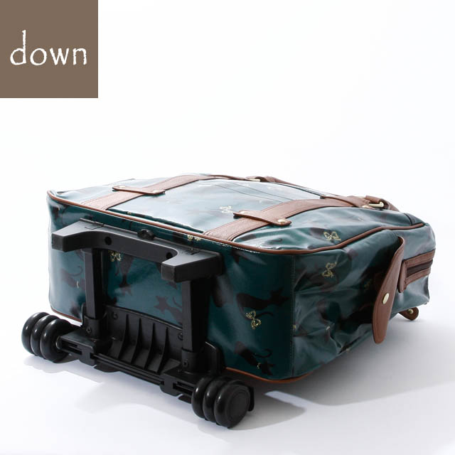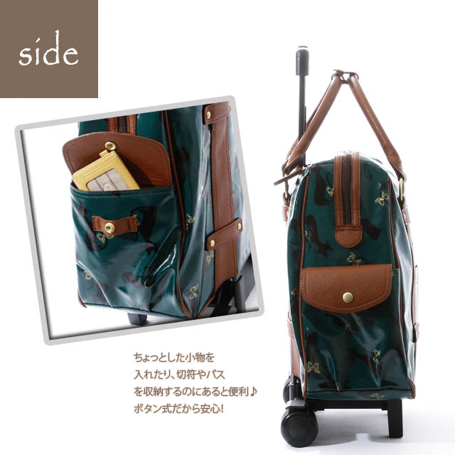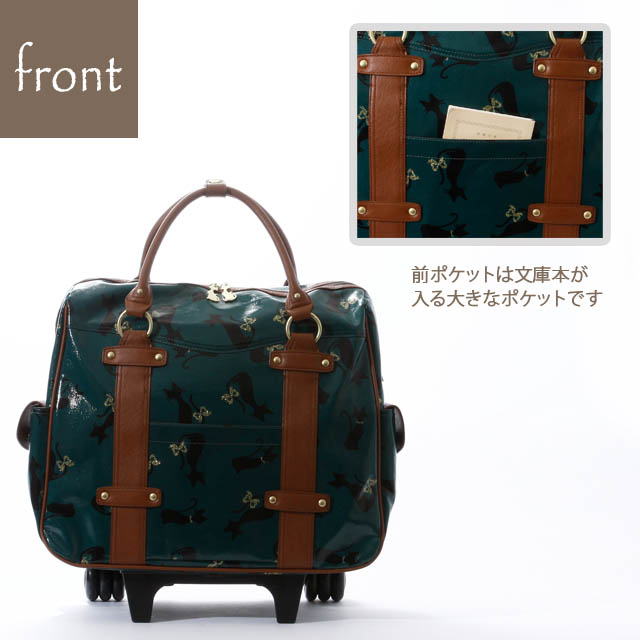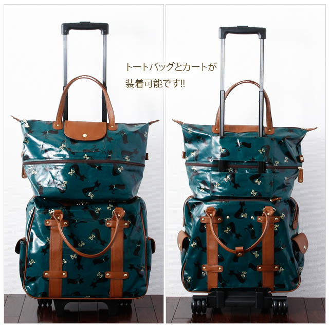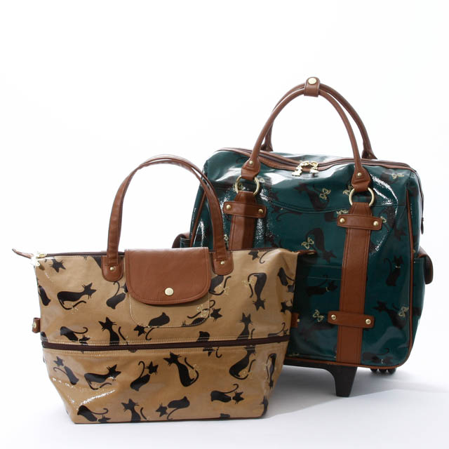 大人気のネコ柄プリントキャリーカート。カートのハンドル部分は2段回の調節が可能なので持ち運びしやすい作り。
