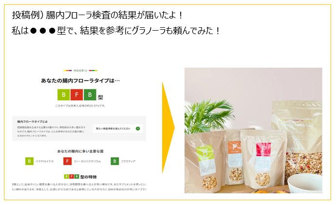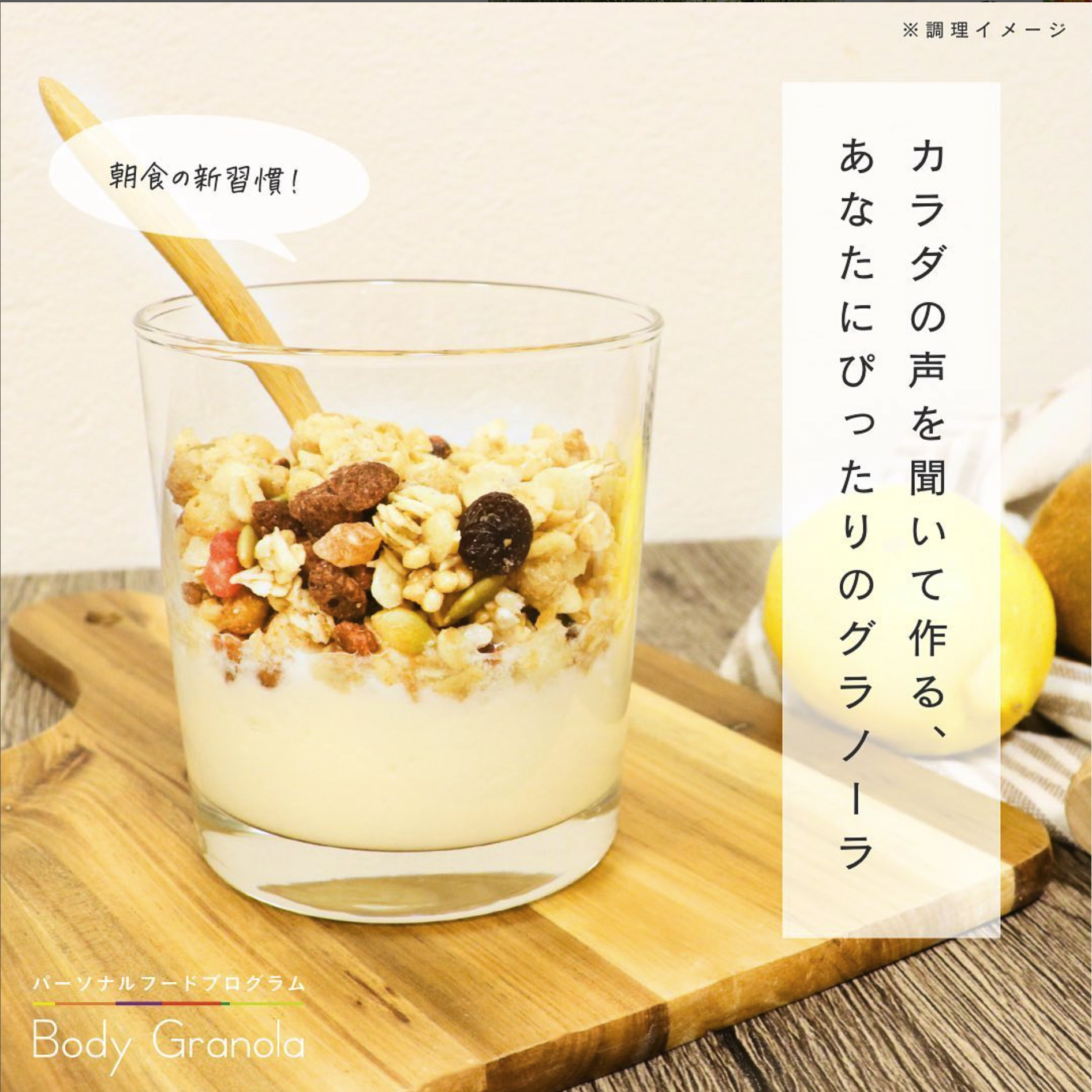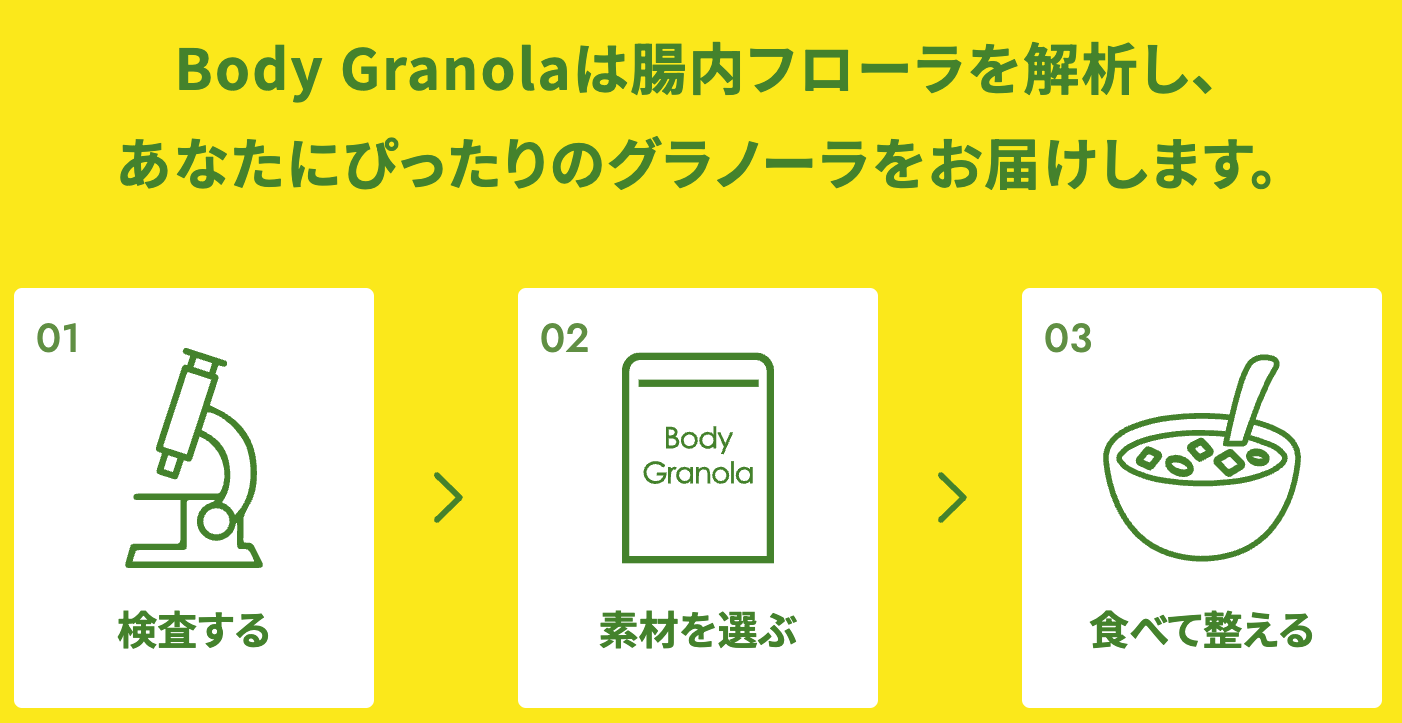 Body Granolaは、腸内フローラ検査から腸内フローラタイプや菌が好む素材がわかり、あなたにぴったりのグラノーラが作れます。