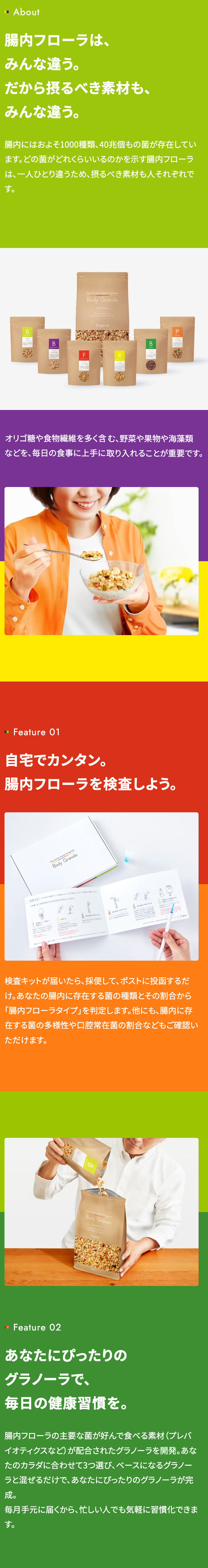 Body Granolaは、腸内フローラ検査から腸内フローラタイプや菌が好む素材がわかり、あなたにぴったりのグラノーラが作れます。