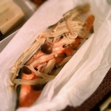 8月19日の夜ご飯 鮭の包み蒸し 高野豆腐 ごぼうサラダ 味噌汁 鮭の包み蒸し オーブンペーパーに包んでレンジで3分 今までホイル焼きで20分くらい焼いてたのは何だったんだってくらい… 2013/08/20