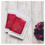 オリーブ油、プラセンタエキス(豚由来)、食用紫菊花粉末、ザクロ花エキス、ハスの花エキス、バラ花ビラ抽出物、桜花エキス/ゼラチン、グリセリン、グリセリン脂肪酸エステル、ミツロウ、ビタミンE