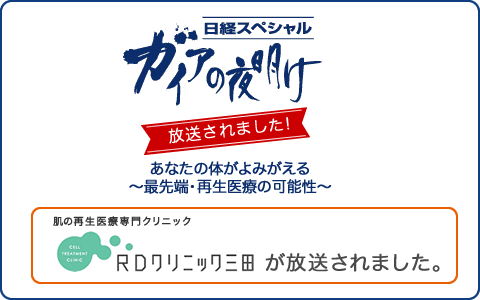 株式会社セルバンク(http://www.cellbank.co.jp/index.html)は、再生医療の会社です。しわ・たるみ・くまを治療する肌の再生医療をその1つとして、行っております。RDクリニック三田(http://www.rederm.com/)