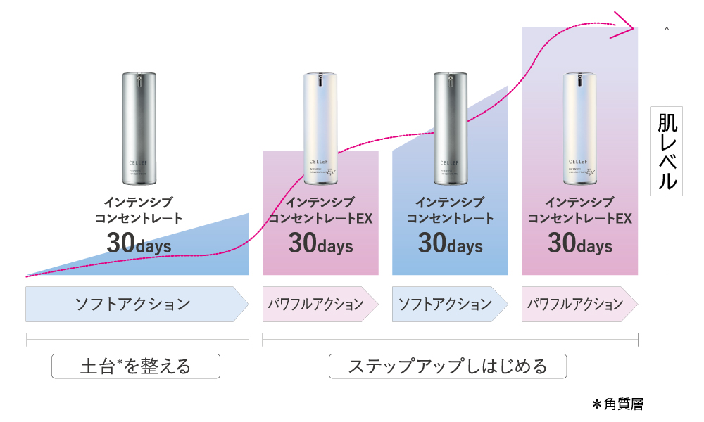角質層のコンディションが低下することで様々な肌悩みが表れてくる年齢肌には、肌の状態に合わせて強弱をつけながらアプローチすることが大切です。セルエフは肌のサイクルに合わせて2種類の美容液を交互に使って効率良く肌をステップアップさせていく独自のメソッドを開発しました。