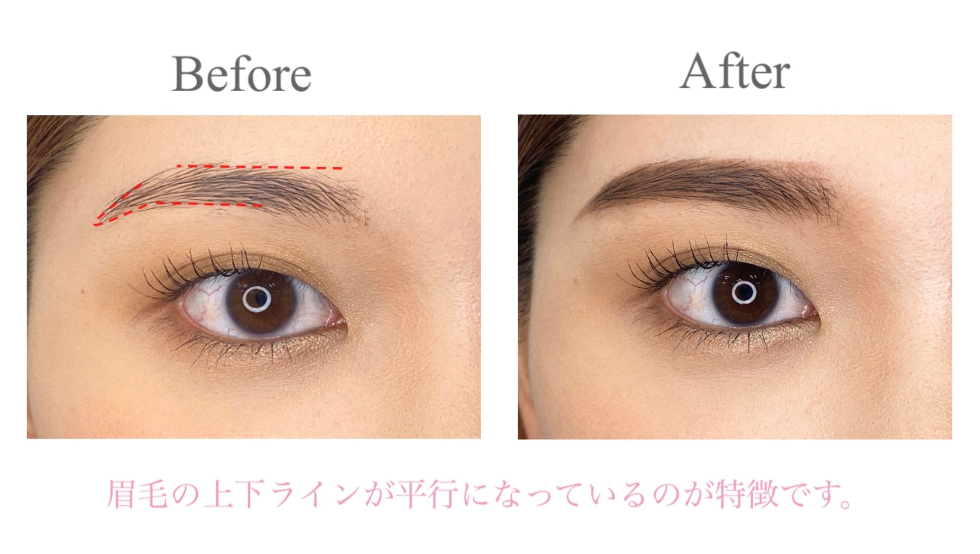 ●眉下を平行に描き足し、眉尻は形に沿って描きます。