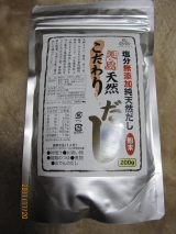 天然こだわりだしは、生鮮イワシ、昆布、カツオ、椎茸、サトウキビの食物繊維、無臭ニンニクの主原料により租エキスを抽出し超純水を作る製法で無脂肪純水溶性カルシウム、たんぱく質、食物繊維を精製しております。