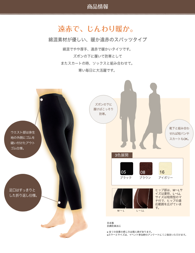 遠赤で暖かい、シャルレのスパッツタイツです。 腰・ヒップ・脚を安心の暖かさで包みます。 やや厚手で抗菌防臭加工をプラスしています。 レビュー数 : 66 |