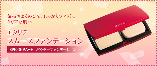 すーっとなめらかにのびて、ぴったり美しくフィット。 「エタリテ スムースファンデーション」は、ひとぬりで手早く簡単に、ムラや粉っぽさのない自然な肌に仕上げられる新感覚のパウダーファンデーションです。 肌のうるおいを保って、乾燥や紫外線などから肌を守り、しっとりするのにさらっとした心地よさを保ちます。( SPF20・PA+)