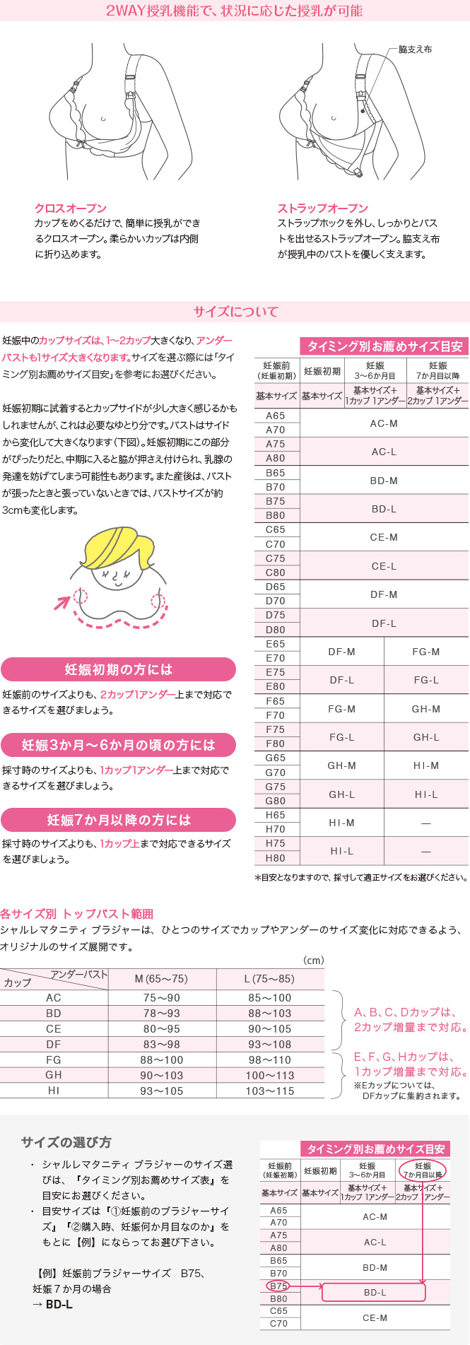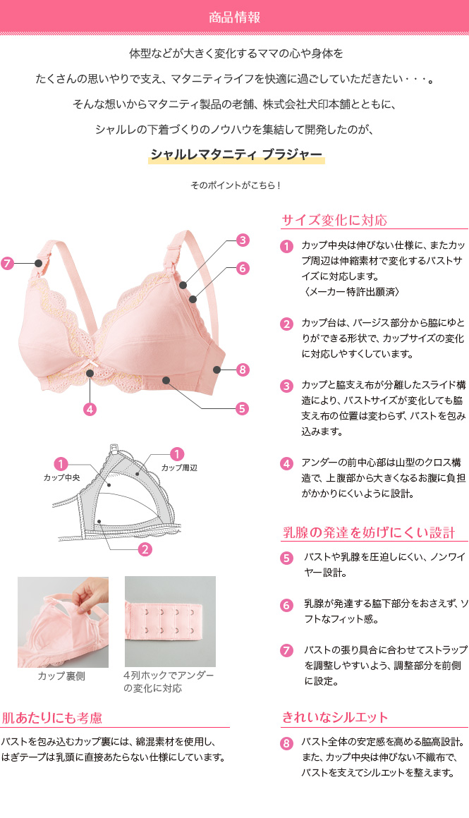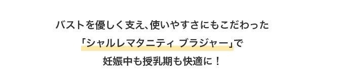 「シャルレマタニティ ブラジャー」は、バストの変化に対応し、産前から授乳期まで使えるブラジャーです。状況に合わせて授乳できる、便利な2way授乳機能。身生地はソフトな綿混素材を使用。吸汗・吸湿性があり、柔らかな着け心地でバストを優しく包み込みます。バストを優しく支え、使いやすさにもこだわった「シャルレマタニティ ブラジャー」で妊娠中も授乳期も快適に!