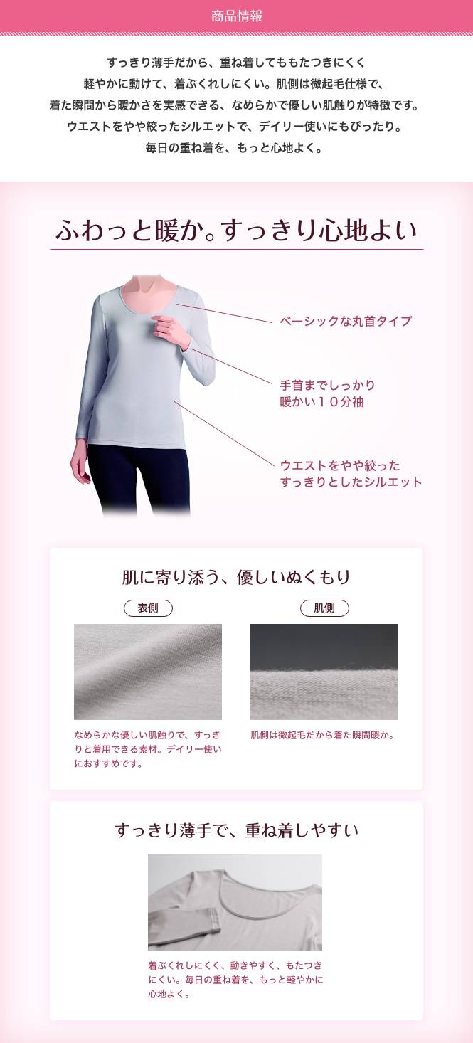 着た瞬間から暖かい、肌側微起毛のインナー。