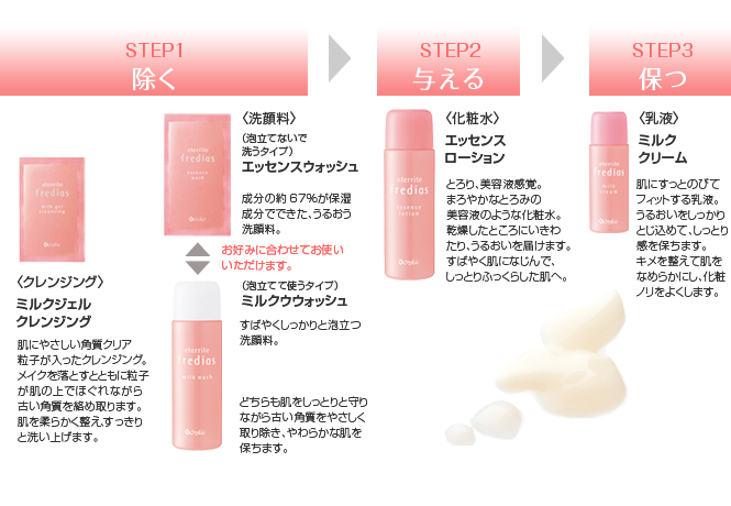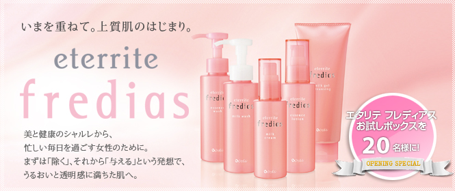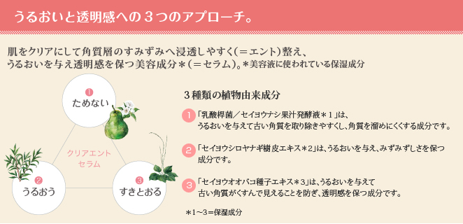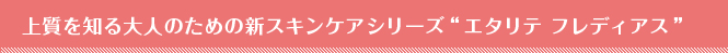 エタリテ フレディアスは、「与える」だけでなく、「除く」お手入れでも角質層にアプローチ。全アイテムに配合した3種類の植物由来成分からなる角質ケア成分「クリアエントセラム」の働きで溜まりがちな角質をケアして、うるおいと透明感に満ちた肌へと導きます。