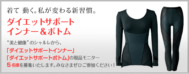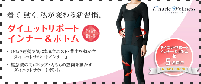 シャルレの「ダイエットサポートインナー」と「ダイエットサポートボトム」は、いつもの生活スタイルを変えることなくダイエットをサポートしてくれるインナーです。独自の設計と生地のパワーバランスにより、消費カロリーの増加を促します。