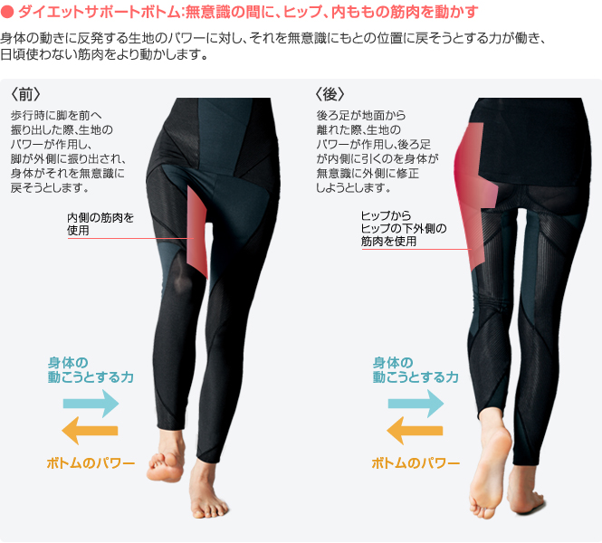 身体の動きに反発する生地のパワーに対し、それを無意識にもとの位置に戻そうとする力が働き、日頃使わない筋肉をより動かします。