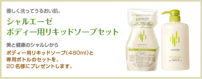 ボディー用リキッドソープ(480ml)と専用ボトルのセットを、20名様にプレゼントします。