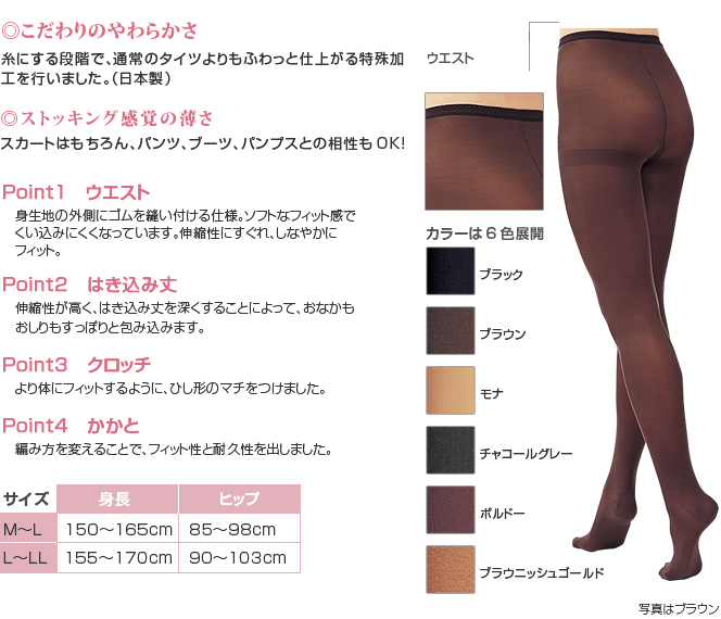 心地良い肌触りで伸びが良く、薄手でも暖かいストッキング感覚のタイツ。