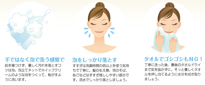 肌はとてもデリケート。洗顔料の泡は、肌と手の平の間でクッションとなり、余計な摩擦を防いでくれます。