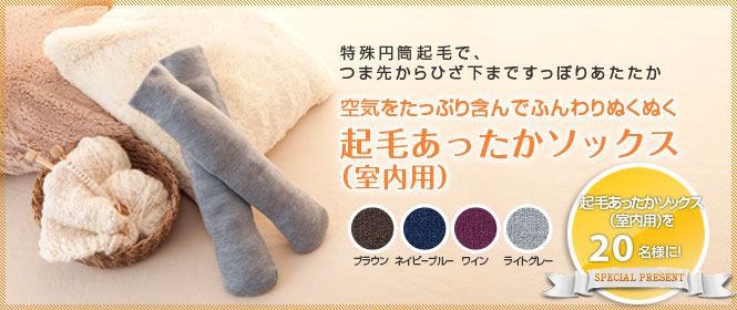 空気をたっぷり含んでふんわりぬくぬく。特殊円筒起毛で、つま先からひざ下まですっぽりあたたか。
