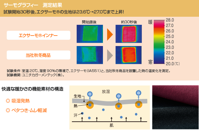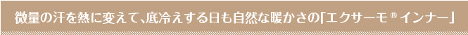 吸湿発熱素材エクサーモ(R)が微量の汗を熱に変えて、底冷えする日も自然な暖かさ。