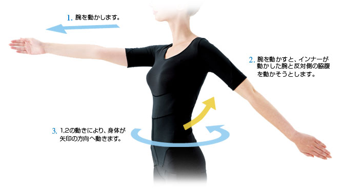 着用して動くことで、ひねり運動でウエスト・背中を動かします。