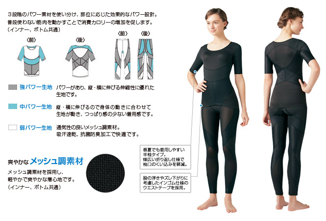 日常的に着用して動くだけで、背中や太ももなど使われにくい筋肉に運動効果をプラスします。